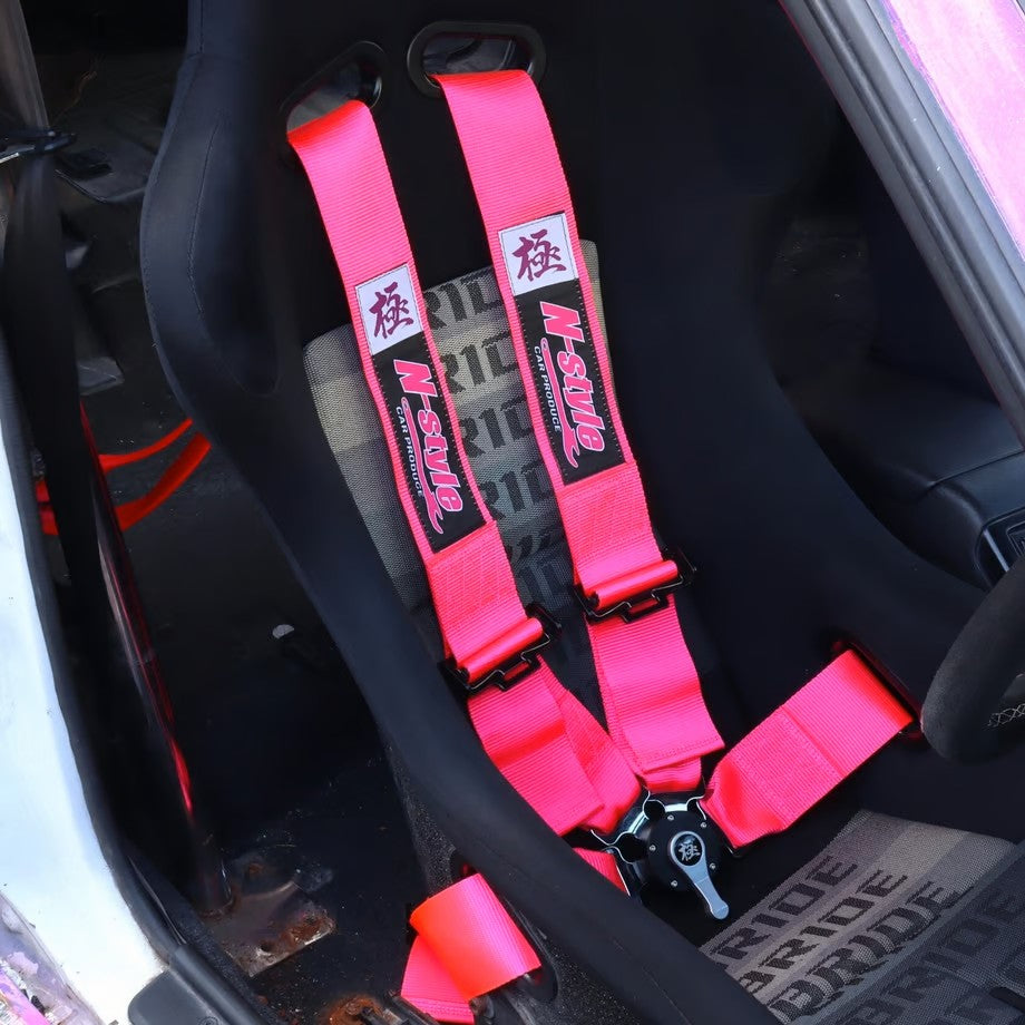 Nakamura Naoki's N-STYLE 4-point racing harness. Featuring a vibrant pink colour, with stitched on logo patches.