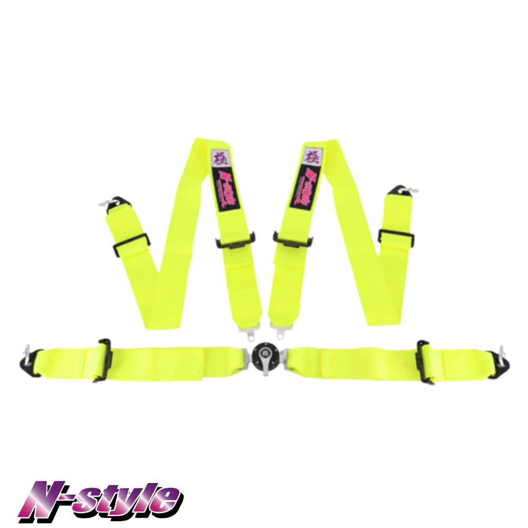 Nakamura Naoki's N-STYLE 4-point racing harness. Featuring a Fluro yellow colour, with stitched on logo patches.